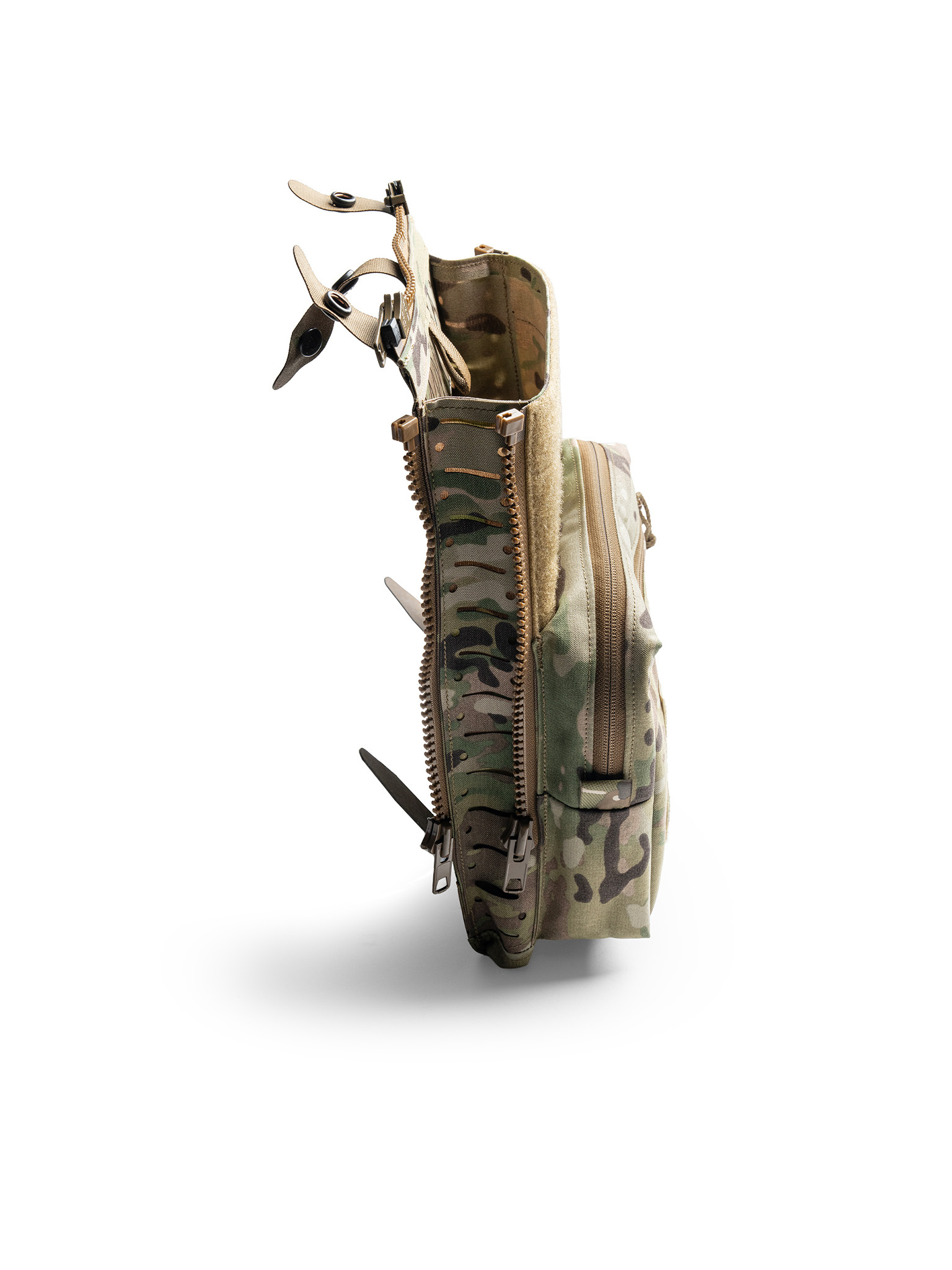 1) Configuration 1 uses the outermost zippers to attach the panel to the plate bag. This compresses the panel and allows it to be worn in a "light" configuration. Ideal for users who want a streamlined fit and only need to carry breaching tools, slap charges, flash bangs and GP kit on their backs.